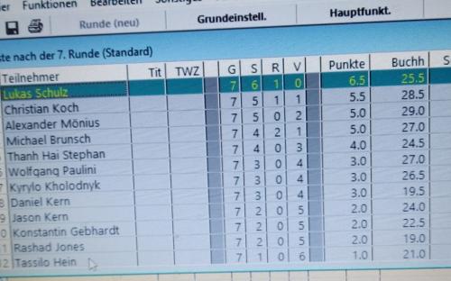 12 Spieler bewarben sich um die Punkte. Der Favorit FM Lukas Schulz startete mit einem remis gegen Michael Brunsch ruhig in das Turnier. Durch das Remis bekam er in den nächsten Runden vermeintlich schwächere Gegner. Aber ob schwächer oder stärker, er gewann alle weiteren Partien und somit das 1. Sommerturnier souverän. Auf Platz 2 folgte mit einem Punkt Rückstand Christian Koch. Alexander Mönius schob sich nur Dank der besseren Wertung vor Michael Brunsch auf Platz 3.