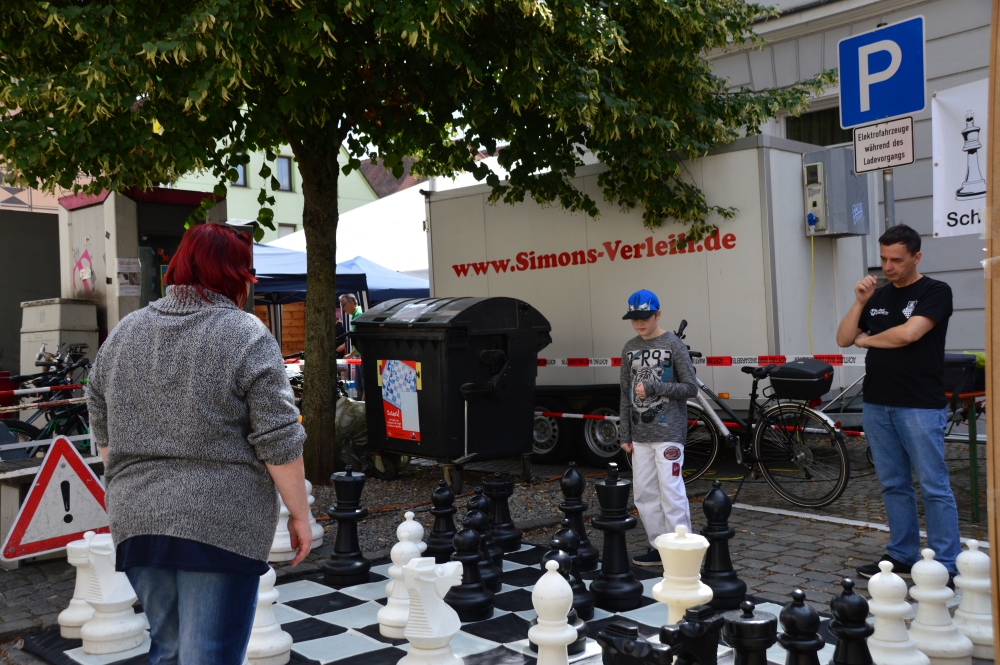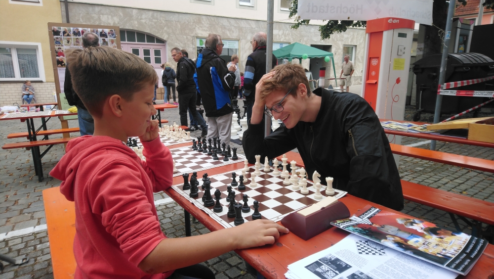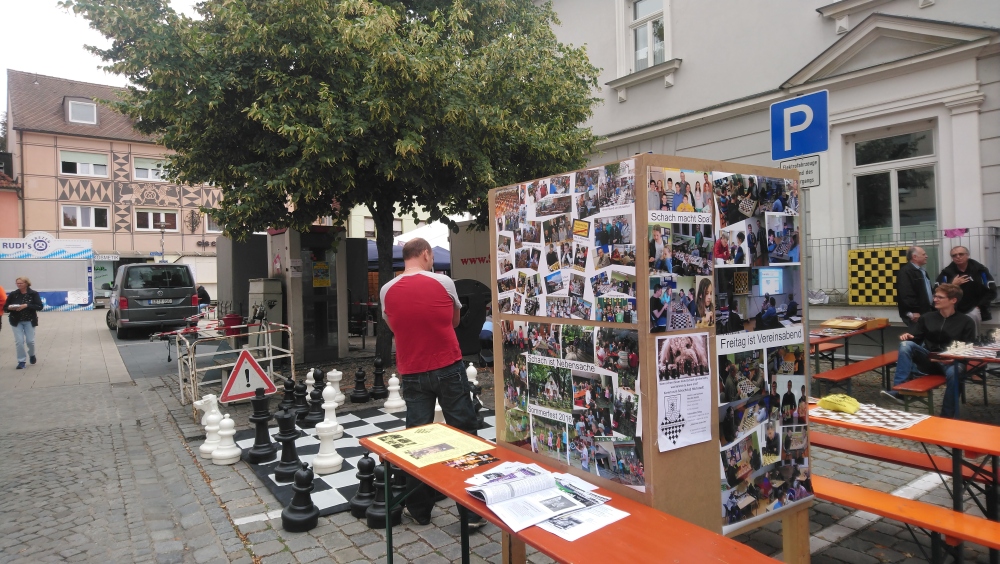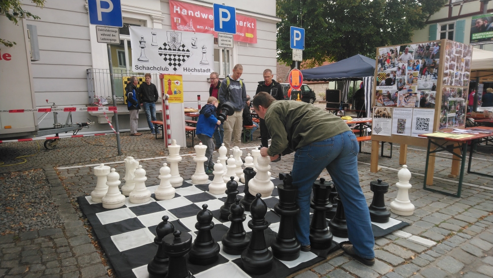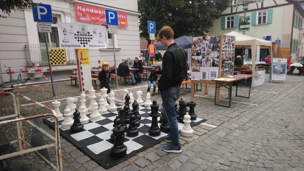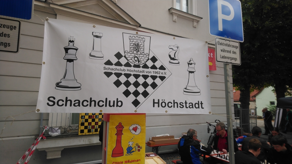 Seit 1985, als die Stadt Höchstadt erstmals das Altstadtfest veranstaltete, ist der Schachclub Höchstadt dabei. Waren damals hauptsächlich die Vereine im Fokus - das Altstadtfest war von Anfang an als Fest der Vereine gedacht -, besuchen heutzutage immer mehr Leute eher das abendliche Musikprogramm. Trotz des schlechten Wetters am Samstag - es regnete nach einem Monat mal wieder -, scheuten sich die Schachspieler nicht vor dem Rathaus für das königliche Spiel zu werben. Neben unserem Riesenschach, das die Besucher, egal ob jung oder alt, immer wieder fasziniert, war auch wieder unsere Plakatsäule dabei. Auf dieser stellten wir unseren Verein vor. Umso mehr freute der ein oder andere Ausruf wie "den kenn ich doch" beim Anblick der Bilder.
