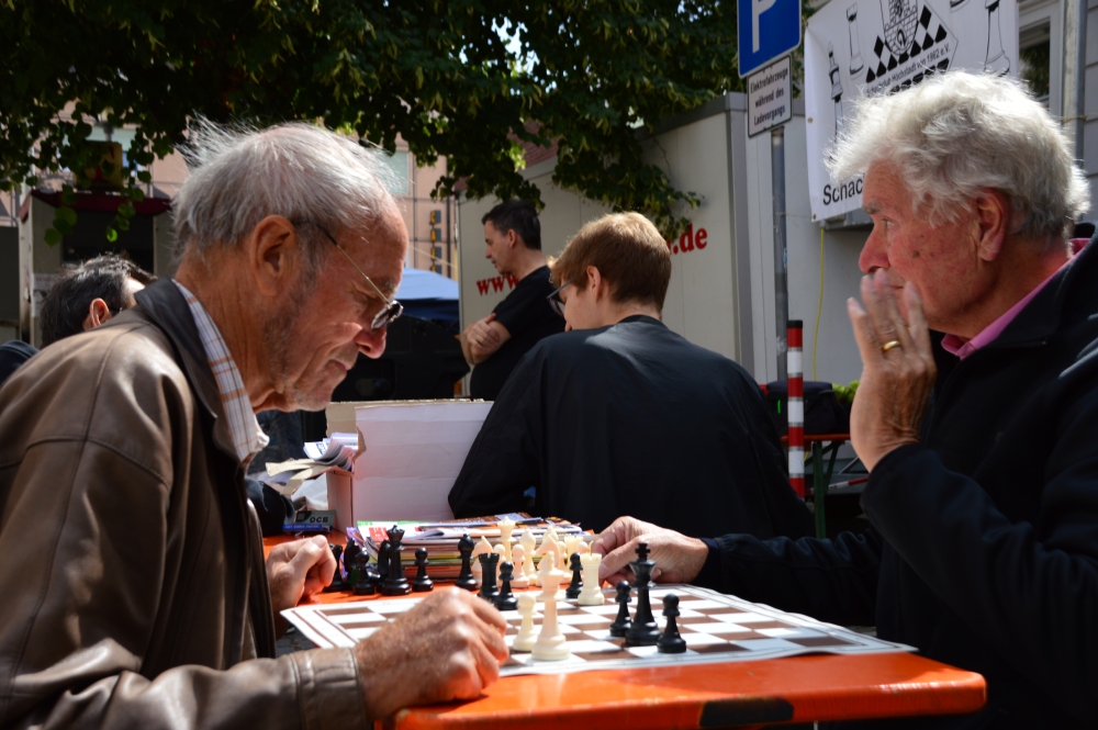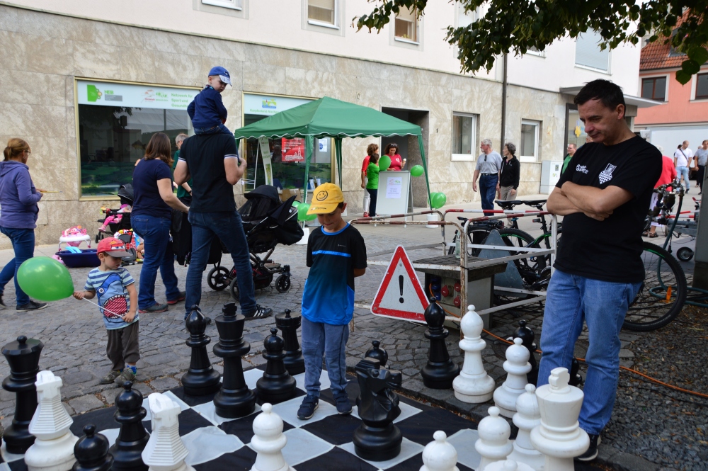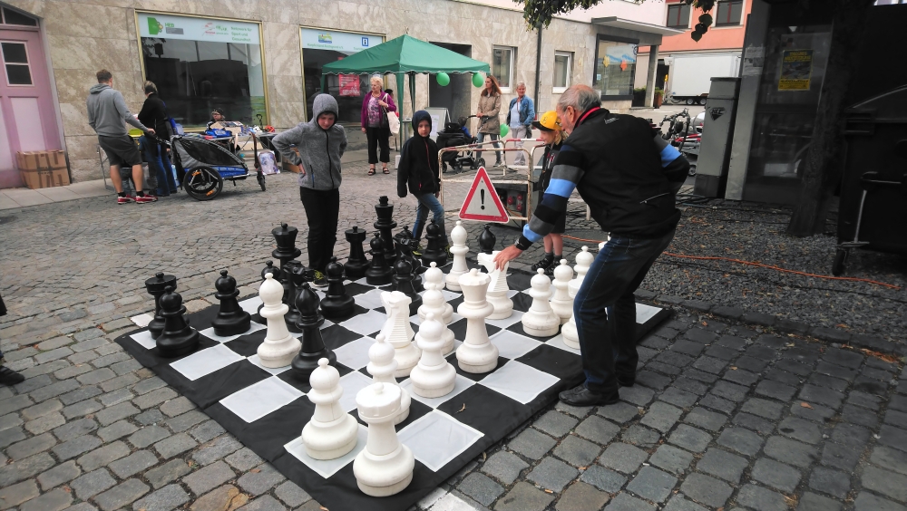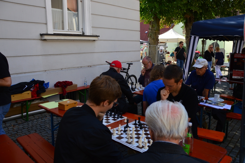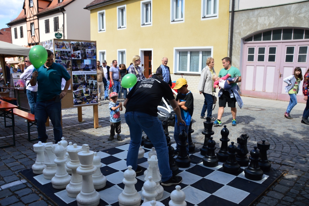 Seit 1985, als die Stadt Höchstadt erstmals das Altstadtfest veranstaltete, ist der Schachclub Höchstadt dabei. Waren damals hauptsächlich die Vereine im Fokus - das Altstadtfest war von Anfang an als Fest der Vereine gedacht -, besuchen heutzutage immer mehr Leute eher das abendliche Musikprogramm. Trotz des schlechten Wetters am Samstag - es regnete nach einem Monat mal wieder -, scheuten sich die Schachspieler nicht vor dem Rathaus für das königliche Spiel zu werben. Neben unserem Riesenschach, das die Besucher, egal ob jung oder alt, immer wieder fasziniert, war auch wieder unsere Plakatsäule dabei. Auf dieser stellten wir unseren Verein vor. Umso mehr freute der ein oder andere Ausruf wie "den kenn ich doch" beim Anblick der Bilder.