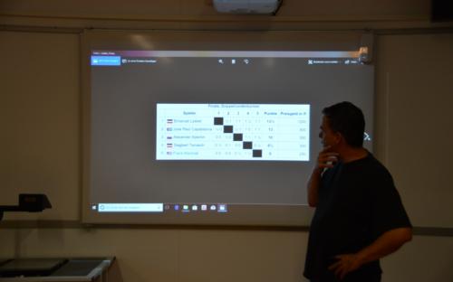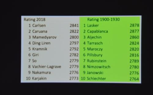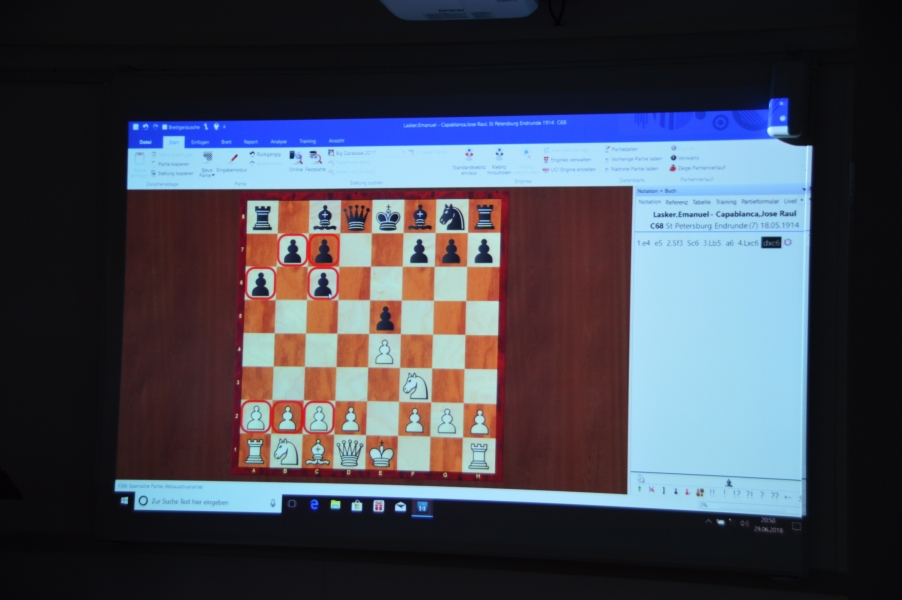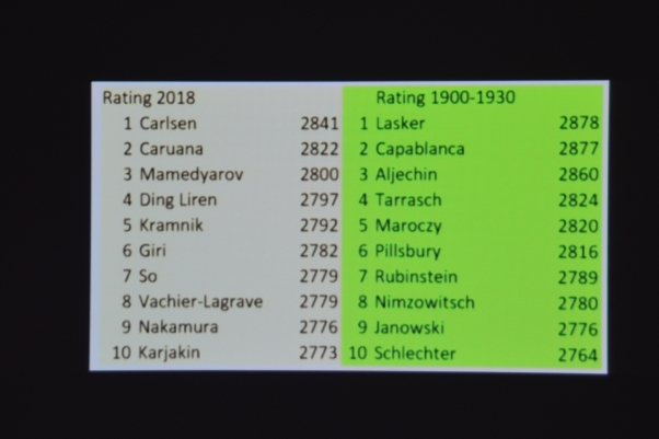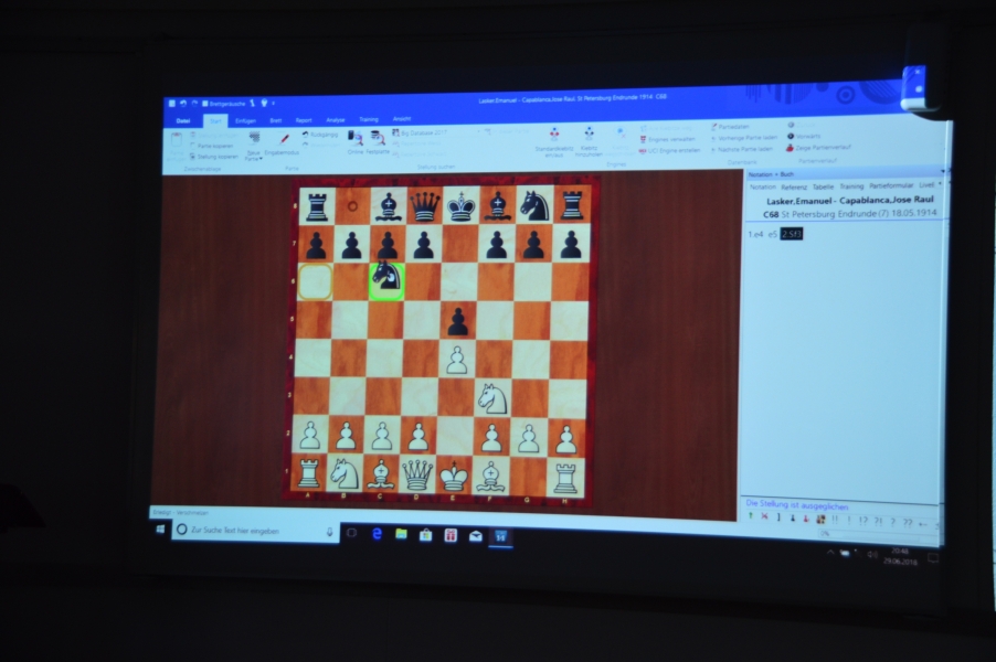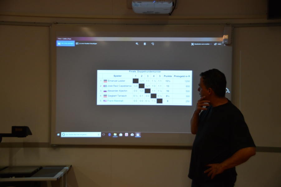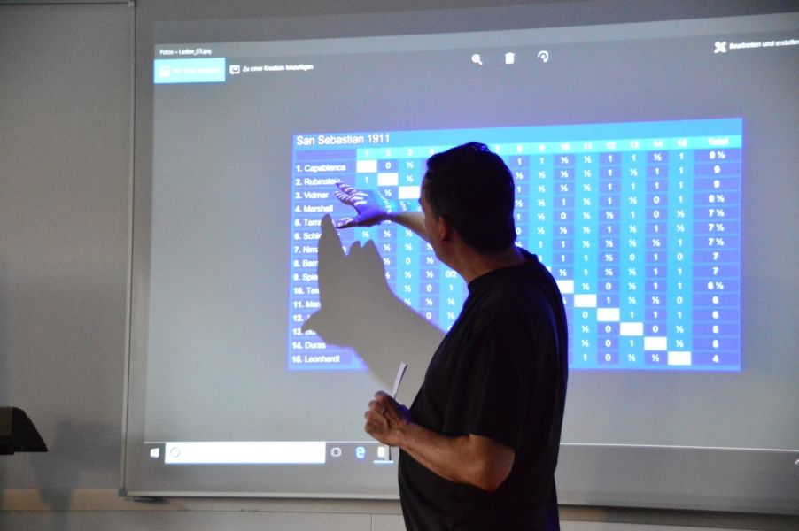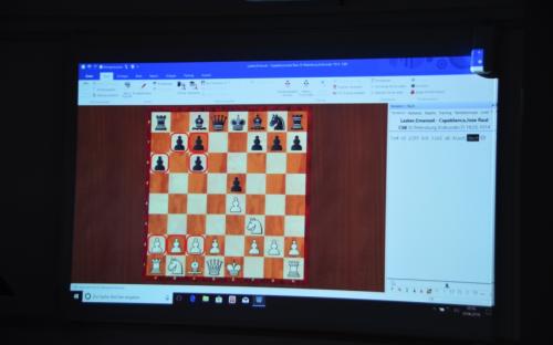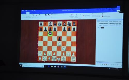 Da sich dies schon zu Beginn des Turniers, das zum 10-jährigen Jubiläum des St.Petersburger Schachclubs veranstaltet wurde, anbahnte, sagten einige Schachspieler ab. Anhand vieler Bilder zeigte Brunsch, wer alles bei diesem Turnier mitspielte. Erstaunt waren die Zuhörer, als Brunsch eine Hochrechnung der ELO-Zahl der Spieler des Turniers zeigte und mit der heutigen Weltrangliste verglich. Daran sah man, weshalb dieses Turnier zurecht zu einem der Besten gezählt wird. Höhepunkt war die im Turnier entscheidende Partie Lasker gegen Capablanca, die Brunsch den Zuhörern erläuterte. Der erfahrene Jugendtrainer ging dabei so vor, dass auch Anfänger sehr gut die Ideen der beiden Schachspieler verfolgen konnten.