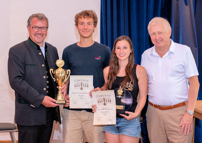 Schirmherr MdL Klaus Stöttner mit Max Hess und Katharina Mehling sowie Peter Eberl (Vorsitzender des Bayerischen Schachbundes)
