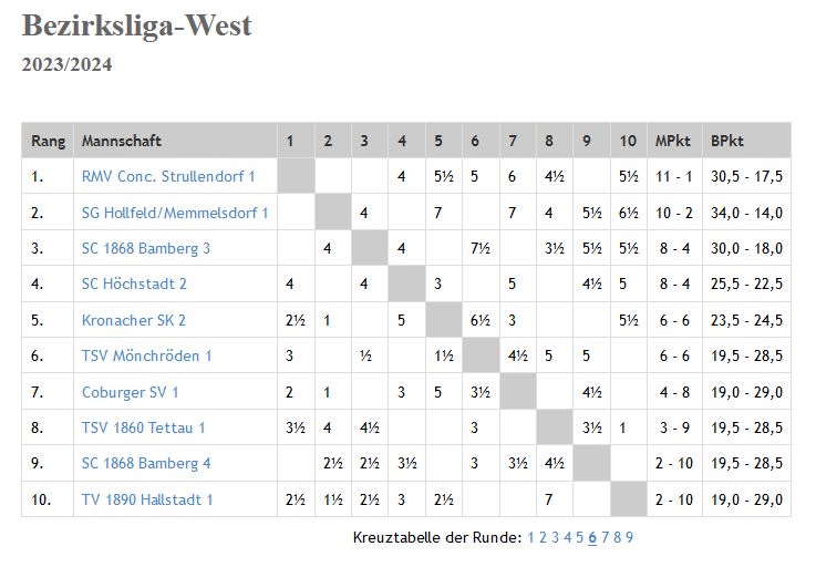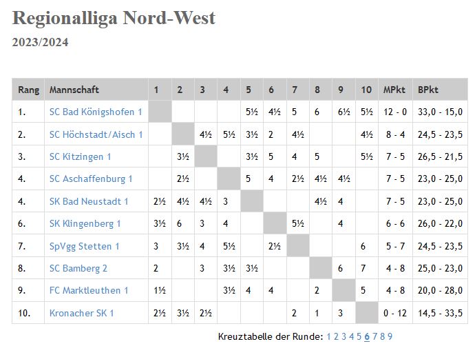 SC Höchstadt 1 gewinnt sein Heimspiel am Sonntag, 25.02.2024 gegen den SC Kitzingen knapp mit 4,5-3,5 Punkten und steht in der Regionalliga NW überraschend auf den zweiten Platz.