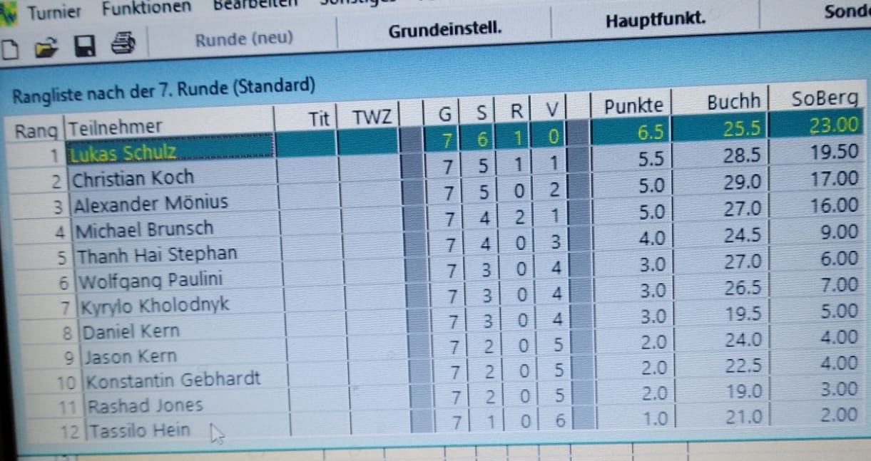 12 Spieler bewarben sich um die Punkte. Der Favorit FM Lukas Schulz startete mit einem remis gegen Michael Brunsch ruhig in das Turnier. Durch das Remis bekam er in den nächsten Runden vermeintlich schwächere Gegner. Aber ob schwächer oder stärker, er gewann alle weiteren Partien und somit das 1. Sommerturnier souverän. Auf Platz 2 folgte mit einem Punkt Rückstand Christian Koch. Alexander Mönius schob sich nur Dank der besseren Wertung vor Michael Brunsch auf Platz 3.