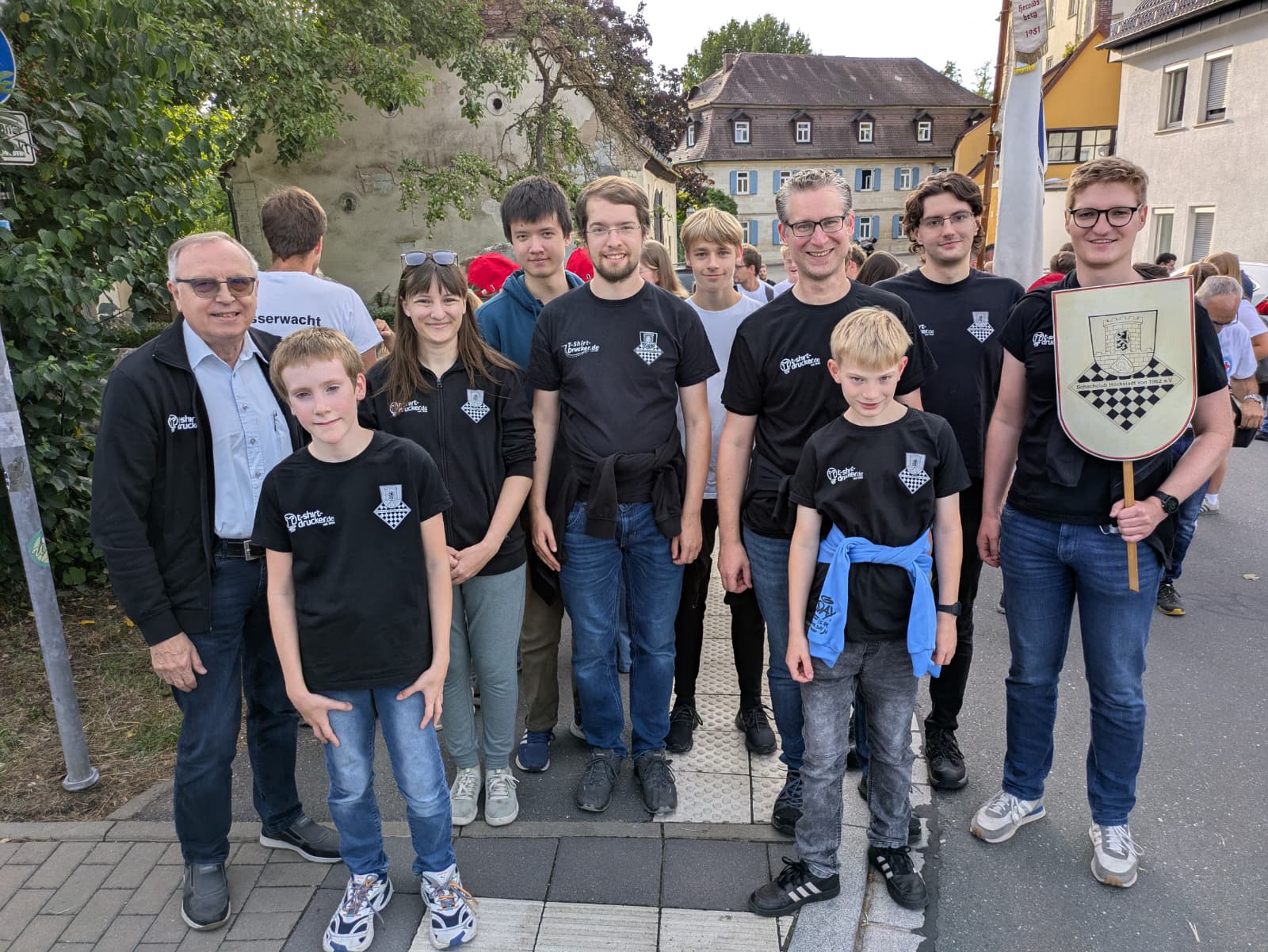 Das 39. Höchstadter Altstadtfest lockte am letzten Augustwochenende wieder, bei überraschend gutem Wetter, Gäste aus Nah und Fern an die Aisch. Es war auch in diesem Jahr eine große Party, mit viel Musik, Kinderflohmarkt sowie Speis & Trank. Wir Schachspieler sind von Anfang an dabei und punkteten erneut mit dem königlichen Spiel. Aber von Anfang an: Am Freitag fand das traditionelle Böllerschießen von der neuen Aischbrücke statt. Anschließend zogen die Vereine, angeführt vom Spielmannszug der freiwilligen Feuerwehr Höchstadt, durch die Altstadt in das Festzelt am Marktplatz.