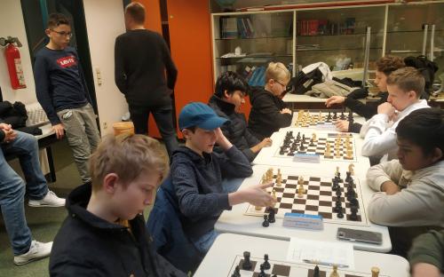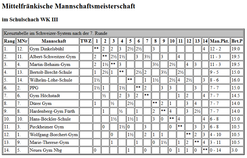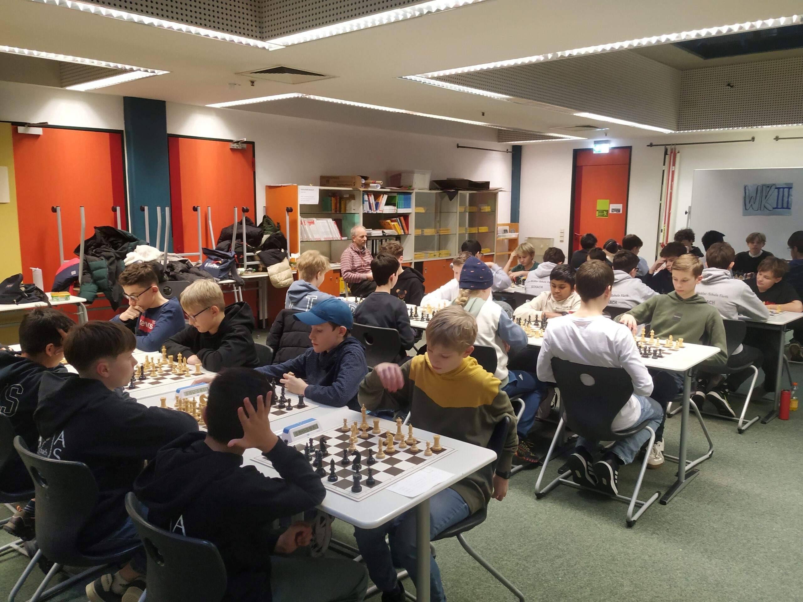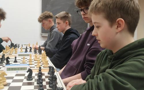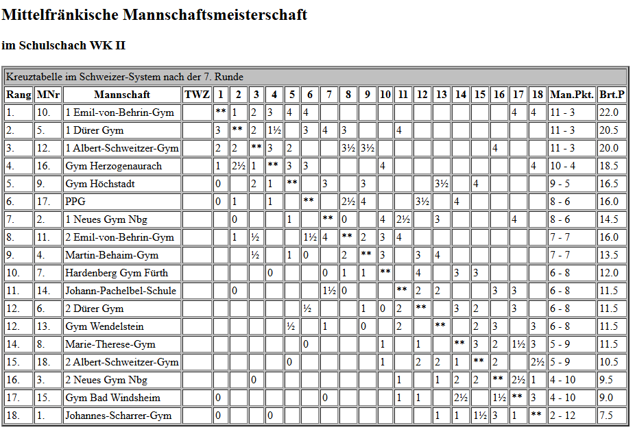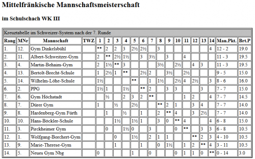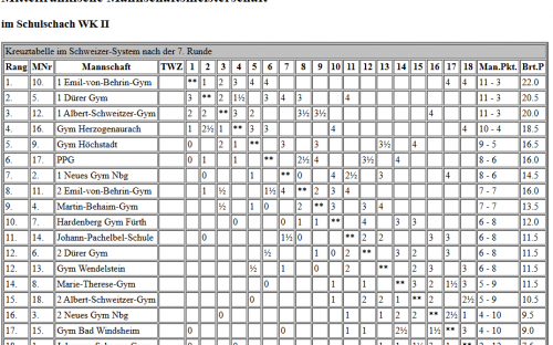 Für das Gymnasium starteten in der Wettkampfklasse 2 Johannes Laubinger, Valentin Rudloff, Jakob Gugel und Louis Oeser und in der Wettkampfklasse 3 Paul Schwarzmann, Adrien Marois, Shourjo Mitra, Jonas Kallies und Jonas Beinlich. Es wurden 7 Runden Schnellschachpartien zu je 20 Minuten Bedenkzeit gespielt. Das Teilnehmerfeld war mit sehr guten Schachspielern aus der Spitze Mittelfrankens und sogar Bayerns besetzt, so dass mitunter jeder kleinste Fehler bestraft wurde und zum Verlust einer Partie führen konnte. Unsere Teams kämpften wacker und konnten gut mithalten, mussten sich aber dennoch einigen besonders starken Mannschaften geschlagen geben. Am Ende konnte sich unser Team in WK 2 mit 4 Siegen, einem Unentschieden und zwei Niederlagen den fünften Platz von den 18 teilnehmenden Mannschaften sichern, in WK 3 schafften wir mit zwei Siegen, drei Unentschieden und zwei Niederlagen einen guten siebten Platz im Mittelfeld der 14 Mannschaften.