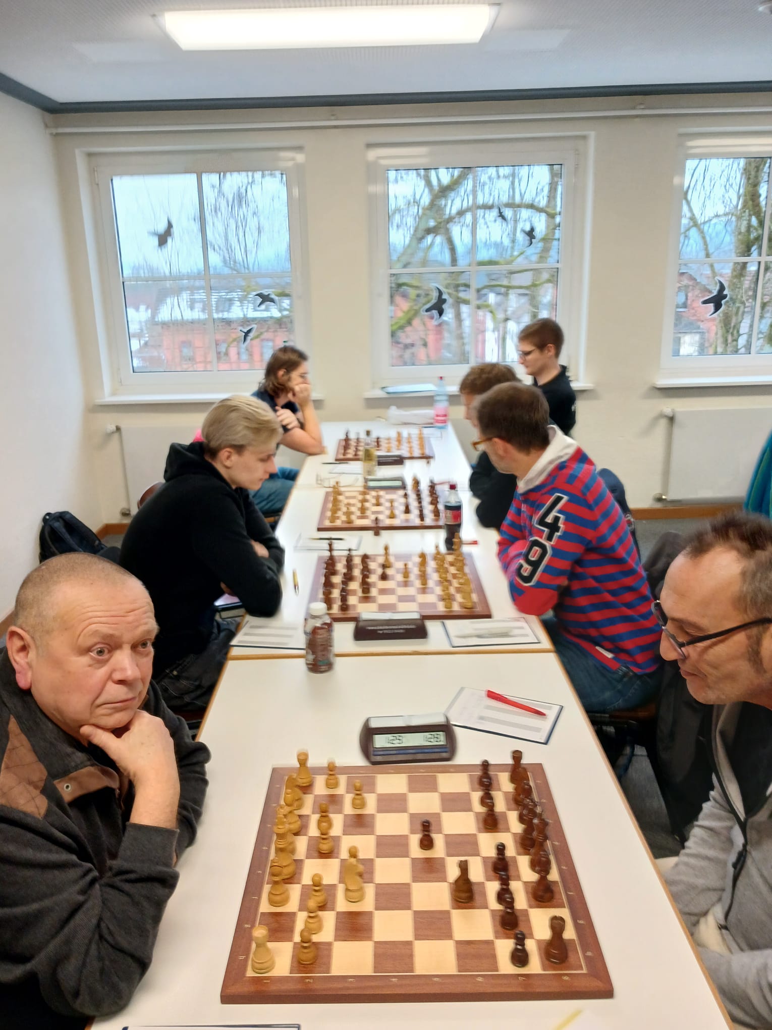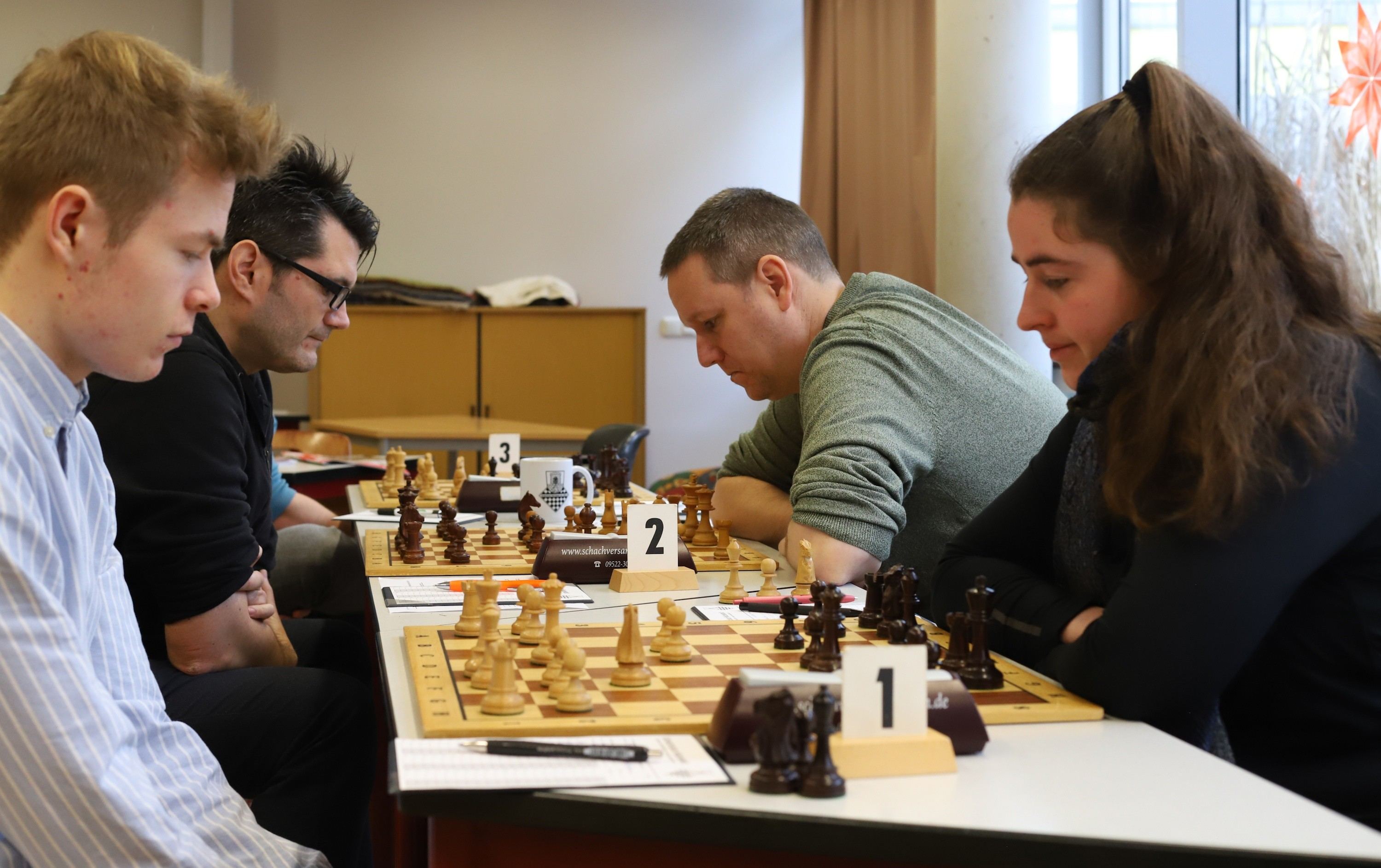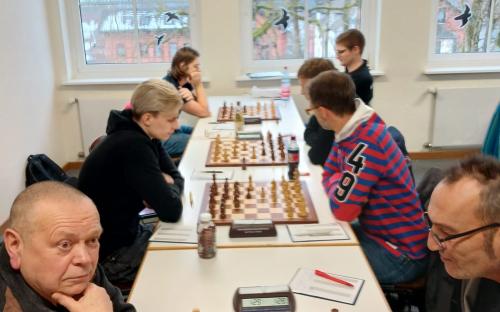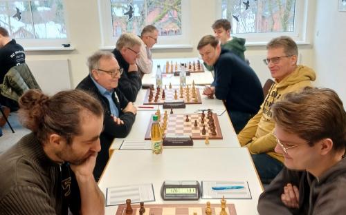 Der Gegner von Andreas Kellmann wies eine geschwächte Stellung während des gesamten Spieles auf und gab dann im Endspiel einen zweiten Bauern drein, so dass es Kellmann gelang, die Kontrolle über seine Partie zu behalten. Obgleich er konstant verteidigen musste, gelang es Alexander Mönius zugleich einen Angriff auf die Königsstellung des Aschaffenburgers Tim Riedel zu starten und sich so eine Atempause zu erringen. Da aufgrund der Komplexität seiner Stellung auf beiden Seiten Vorteile nicht optimal genutzt werden konnten, kam es auch hier zum Remis.