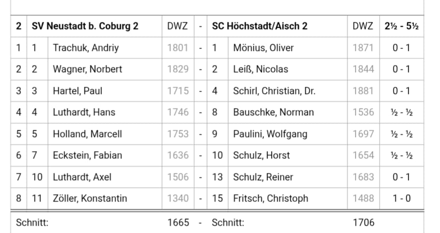 Ebenfalls sehr erfreulich war der Sieg der 2. Mannschaft des SC Höchstadt auswärts zu Gast bei der SV Neustadt b. Coburg 2. Nachdem in den vergangenen Begegnungen in der Bezirksliga West nicht die erwünschten Ergebnisse erzielt werden konnten, war das Ergebnis des vergangenen Spieltages höchst erfreulich. Mit 2,5 : 5,5 schlugen sie ihre Gegner und trugen nur eine Verlustpartie davon.