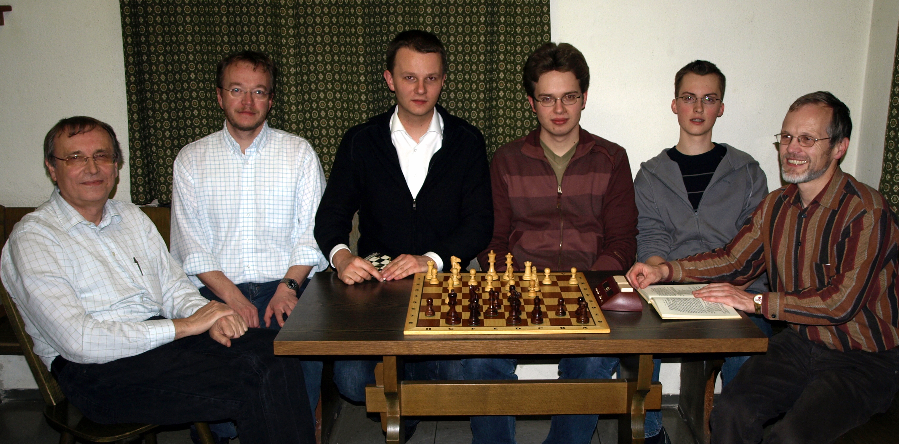 Reiner Schulz, Joachim Kröger, Sebastian Dietze, Schachgeneral Tobias Schwarzmann, Christopher Heckel und Gerhard Leicht