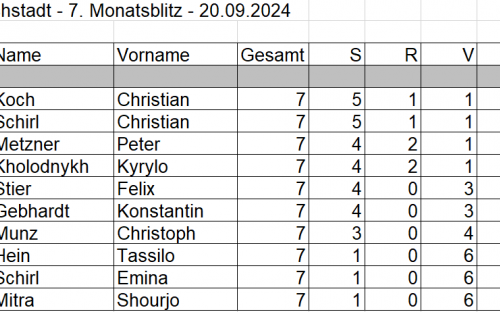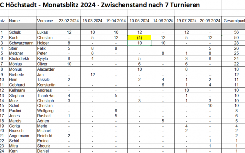 Das siebte Monatsblitzturnier 2024 fand am Freitag, den 20.09.24 statt. Es gewann Christian vor Christian, und zwar Christian Koch vor Christian Schirl Punktgleich, nur durch die Feinwertung getrennt.