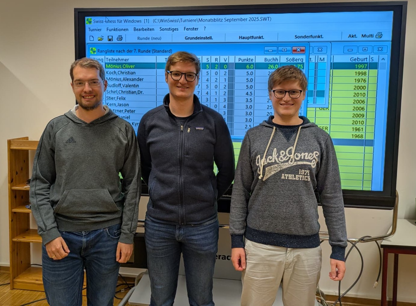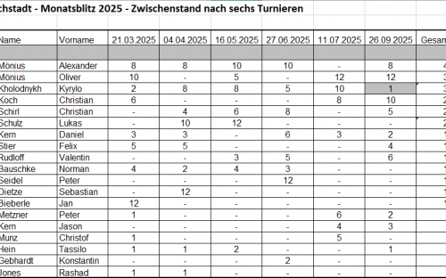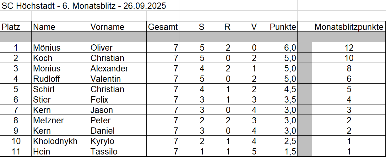 Das sechste Monatsblitzturnier des Jahres 2025 fand am Freitag, den 26.09.2025 statt. 11 Teilnehmer spielten ein Schweizer-System Blitzturnier mit sieben Runden.